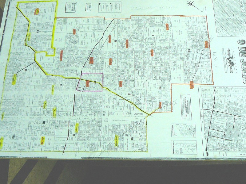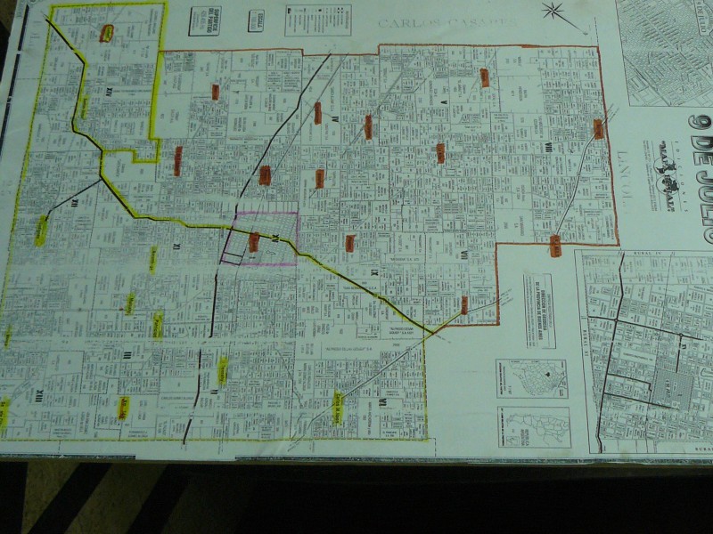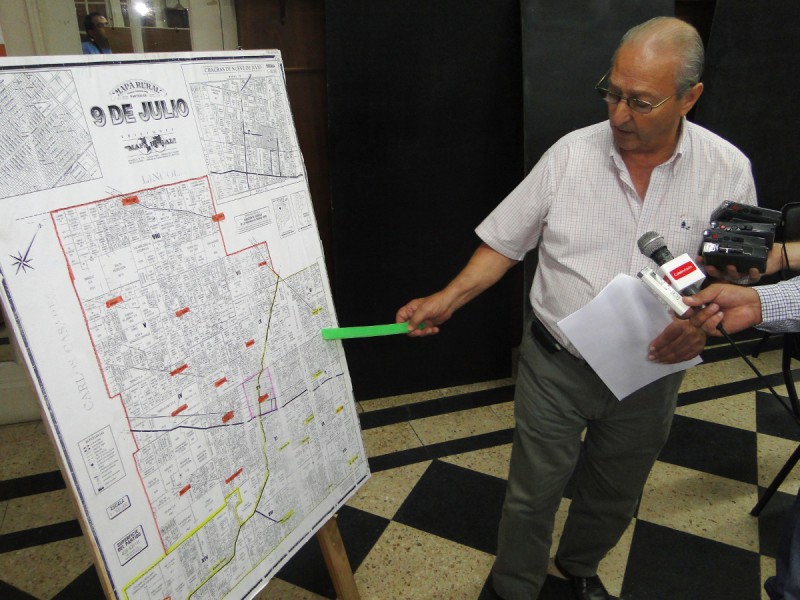 Por su parte, el Secretario de Obras Públicas explicó sobre el mapa del Partido de 9 de Julio los trabajos realizados y remarcó que “hemos tenido un año atípico, con una gran sequía, muchas lluvias y nuevamente sequías”.