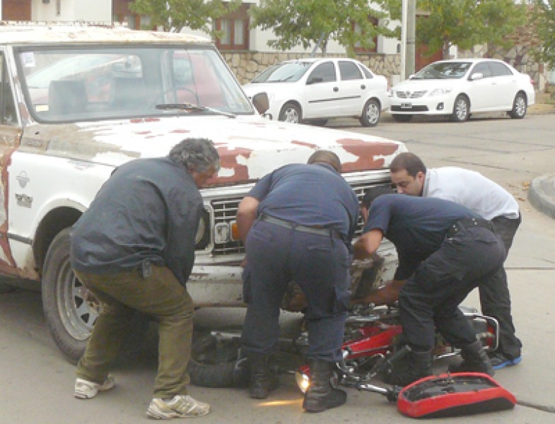 Siendo aproximadamente las 17,30 hs. de ayer, en la intersección de calles Mendoza y Salta de nuestro medio, por causas que se desconocen, colisionaron una pick up Chevrolet de color blanco y una moto Honda Dax, conducida por un menor de edad. Como muestra el grabado y como consecuencia del impacto, la motocicleta quedó aprisionada debajo del tren delantero de la pick up, lo que remite claramente a las consecuencias que podría haber arrojado el accidente.