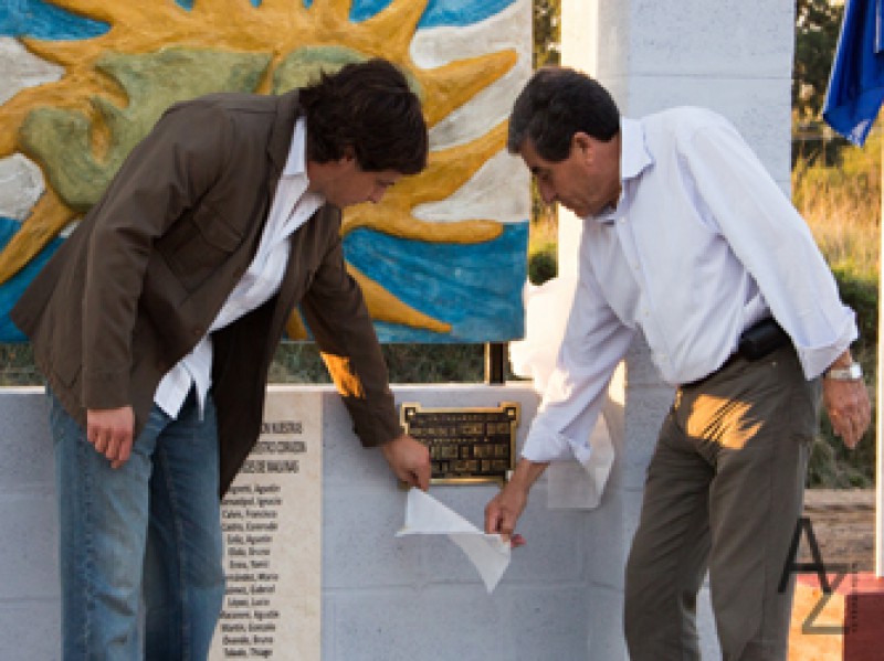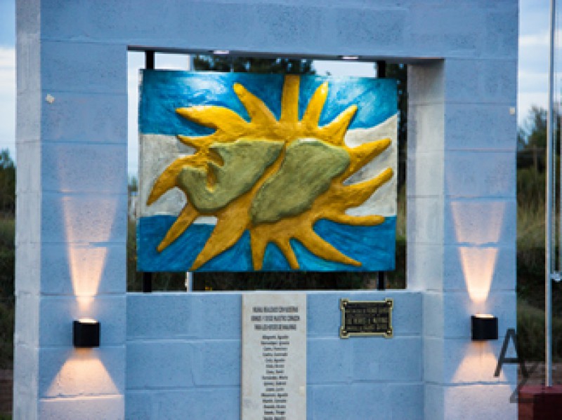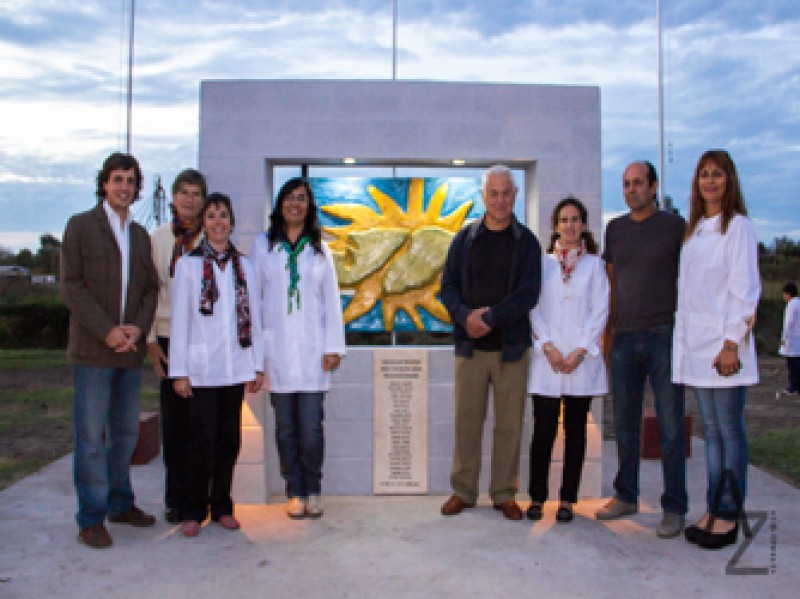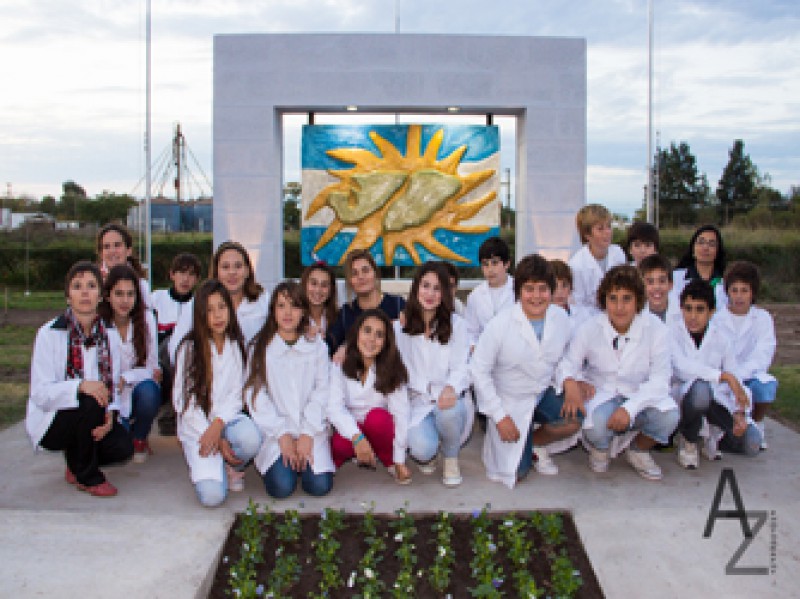 Los chicos conjuntos a su profesora de arte, Mara Lanzi, crearon el escudo en madera, malla de hierro y cemento bajo las normas del concurso que debía tener la bandera nacional de fondo el sol y la imagen de las islas.