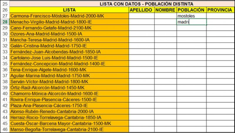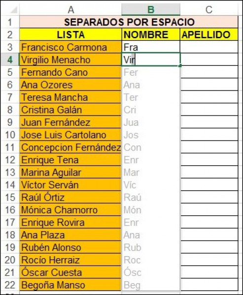 Imagen 1: Opción de 'Relleno rápido' en una lista con datos escribiendo incorrectamente el primero de ellos.