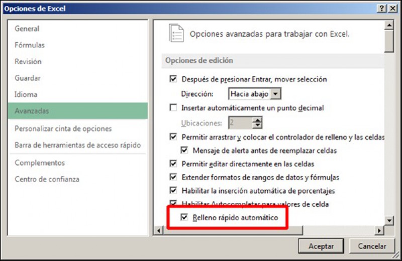Por último se puede desactivar esta opción desde el panel de opciones avanzadas de Excel 2013. En tal caso sólo será posible crear un 'Relleno rápido' a través del mencionado botón.