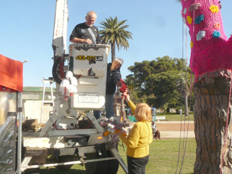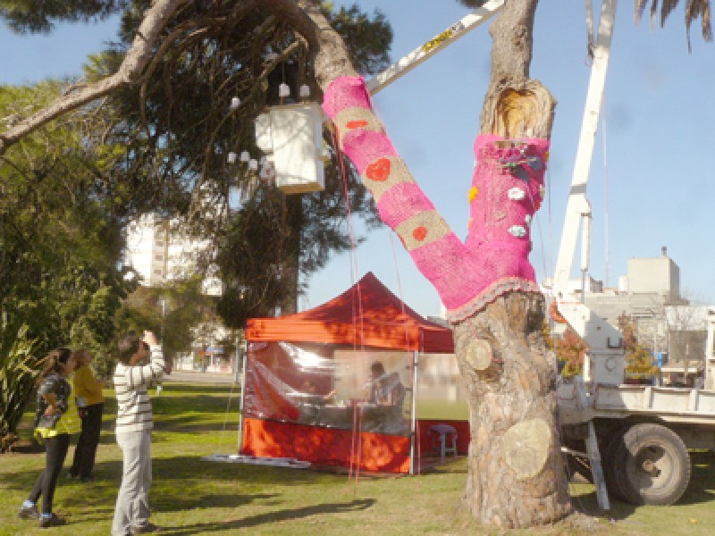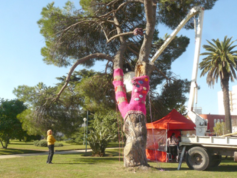 “Esta técnica, de intervención, es trabajar sobre un árbol, trabajamos en crochet que responde a esta corriente artística que es mundial y que se utiliza de distinta manera. Para esta oportunidad, elegí intervenir un árbol y persigo la idea de compartir con la comunidad el colorido, la imagen y forma que modifican en este caso un árbol y que permite a la población lo disfruten, así que agradezco al municipio por darme la infraestructura necesaria para poder realizar esto”, explicó Arocas.
