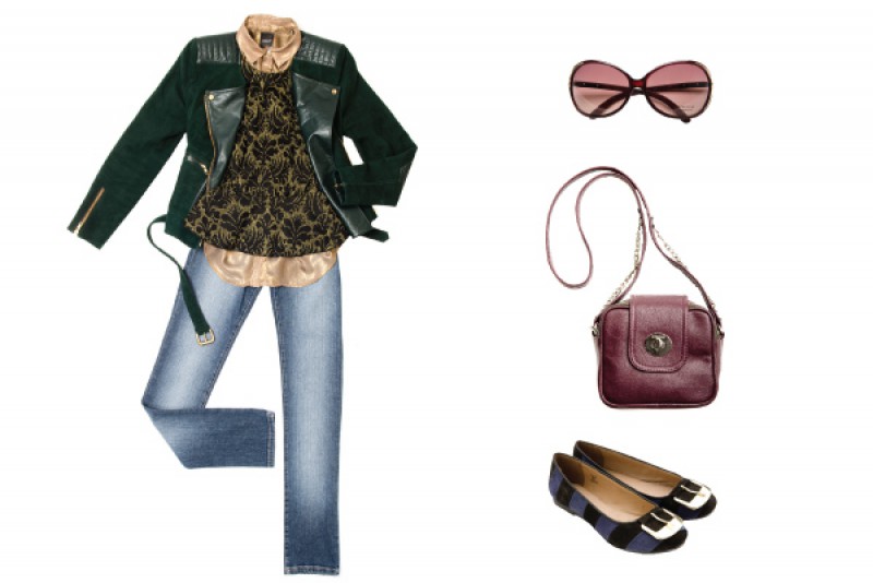 Top Camisa (Complot, $379), top sin mangas con hilo de lúrex (Basement, $348), chaqueta de cuero y gamuza (Ayres, $2998), jeans rectos (Vitamina, $798), gafas (XL, $328), cartera (Blaquè, $419), balerinas rayadas (American Pie, $650) Remera