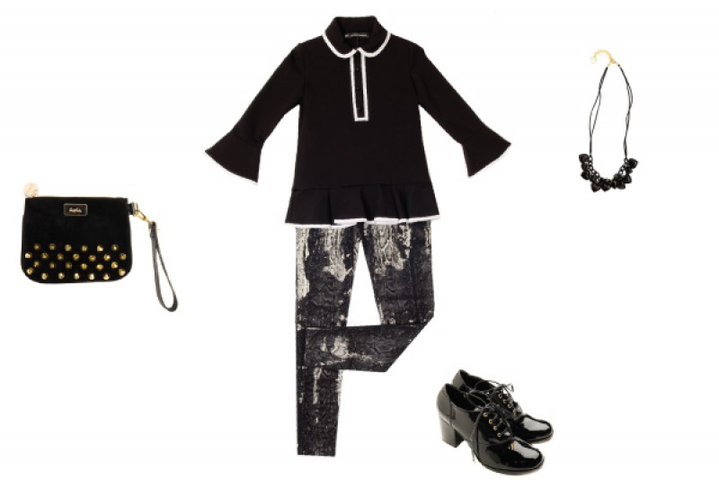 De punto roma y puños evasé (Muaa by Pablo Ramírez, $680), pantalón animal print engomado (Akiabara, $860), collar (Besha, $118), sobre de gamuza con tachas (Besha, $455), zapatos abotinados de charol (Las Pepas, $1490)