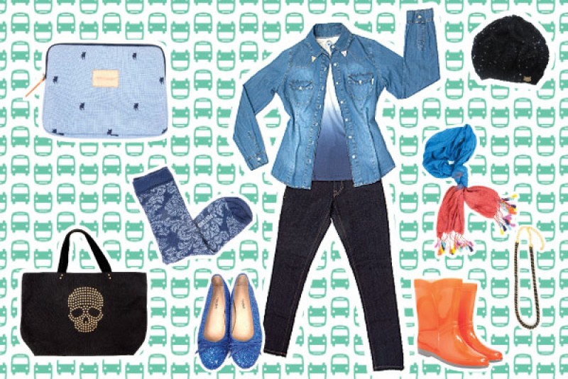 Camisa de denim (47 Street, $499). Remera degradé (Ver, $158). Jeans cigarette (Inversa, $439). Portalaptop (Pesqueira, $359). Gorrito de lana (Tucci, $140). Chalina (Ver, $98). Collar combinado (Ver, $98). -medias (Portsaid, 425). Balerinas con glitter (The Bag Belt, $460). Botas de lluvia (Seco, $260)