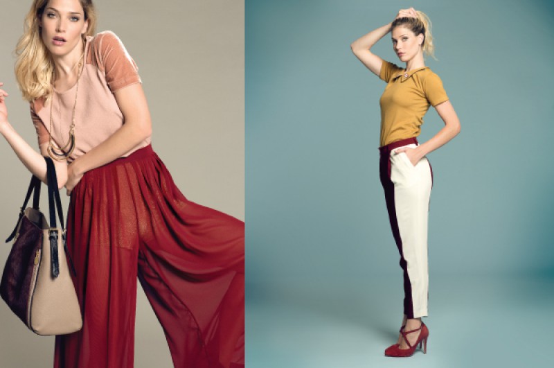 Izquierda: Remera combinada con terciopelo (Vitamina, $642), pantalón ancho de gasa (Las pepas, $549), colgante (Vitamina, $248), cartera de cuero con pelo (Prüne, $1250). Derecha: Top de algodón con cuello bordado (AY Not Dead, $398), pantalón con recorte lateral (Las pepas, $649), zapatos de gamuza con pulsera (Ferraro, $1020).