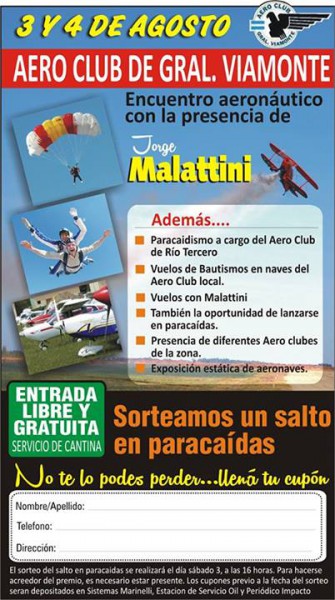 Los días sábado 3 y domingo 4 de agosto, se realizara un Festival Aeronáutico, en el Aeroclub de nuestra ciudad. En el mismo se realizaran bautismos de diferentes actividades, como paracaidismo (a cargo del Club de Paracaidismo Río Tercero), Acrobacia Aérea (a cargo de Jorge Malatini y Carlos Alberto Pool), vuelos (a cargo del aeroclub de General Viamonte), planeadores y parapentes.