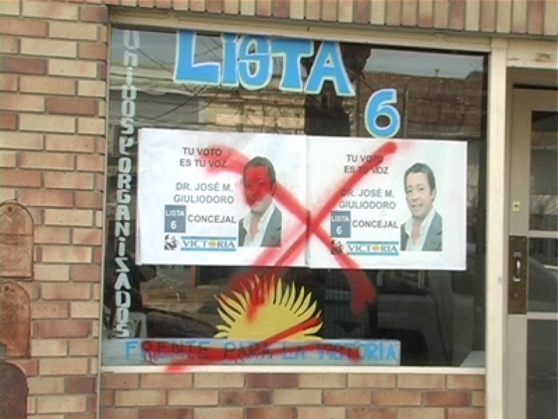 En el transcurso de las últimas horas se observaron pintadas con aerosol en el local de campaña de la Lista 6 del Frente Para la Victoria, que lleva como precandidato a concejal al actual edil del FPV-K José María Giuliodoro, en lo que constituye una repudiable y lamentable actitud antidemocrática y una práctica que debería ser desterrada definitivamente del ámbito político.