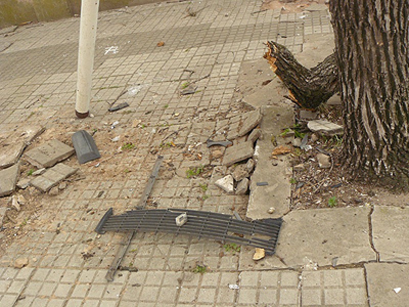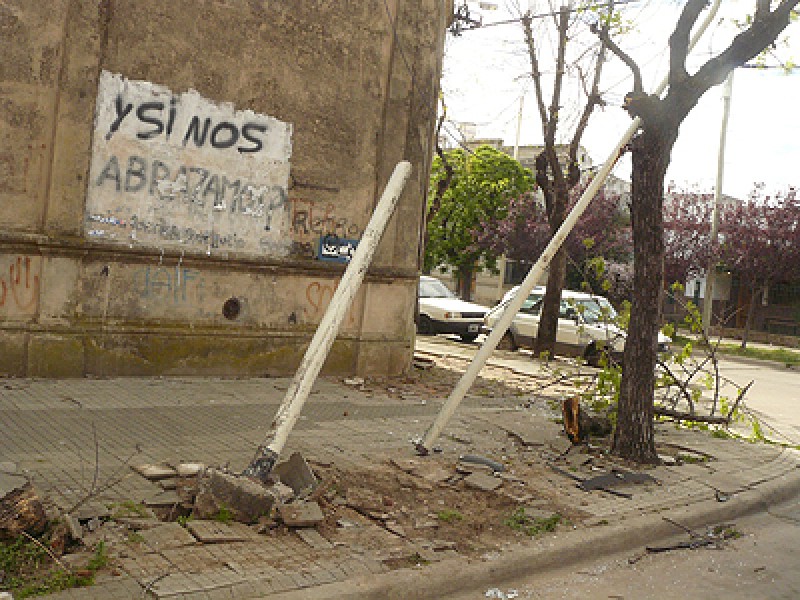 El vehículo se desplazaba por calle Santa Fe y por causas que se ignoran, metros antes de llegar a la intersección de La Rioja pierde el control e impacta contra una columna de alumbrado arrancándola de su base y una planta que arrancó de cuajo. Como ilustra la imagen, restos del vehículo quedaron diseminados en la vereda.