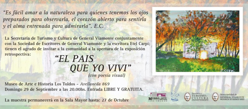 La Secretaría de Turismo y Cultura que dirige Flavio Gulli, conjuntamente con la Sociedad de Escritores de General Viamonte presentarán en el Museo Municipal de Arte e Historia de Los Toldos una exposición de pinturas y poesía de la artista toldense Etel Carpi.