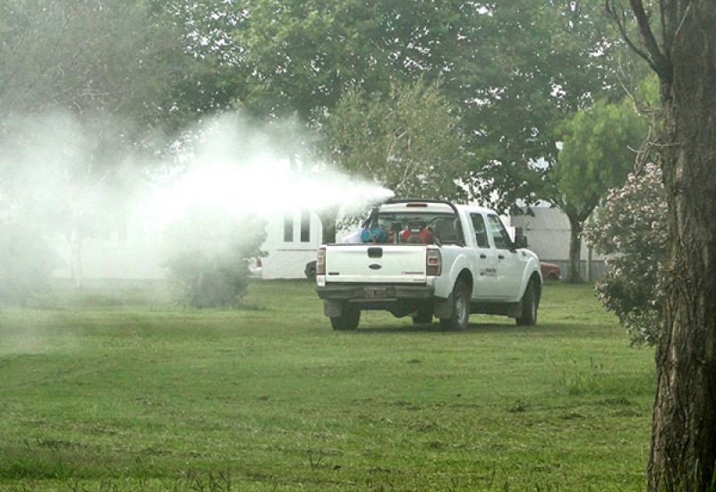 Por su parte, Pablo Marchán, técnico de Saneamiento Ambiental, detalló que los trabajos se realizan mediante una máquina de termoniebla transportada por una camioneta, lo que permite generar una nube de humo que actúa sobre los insectos.