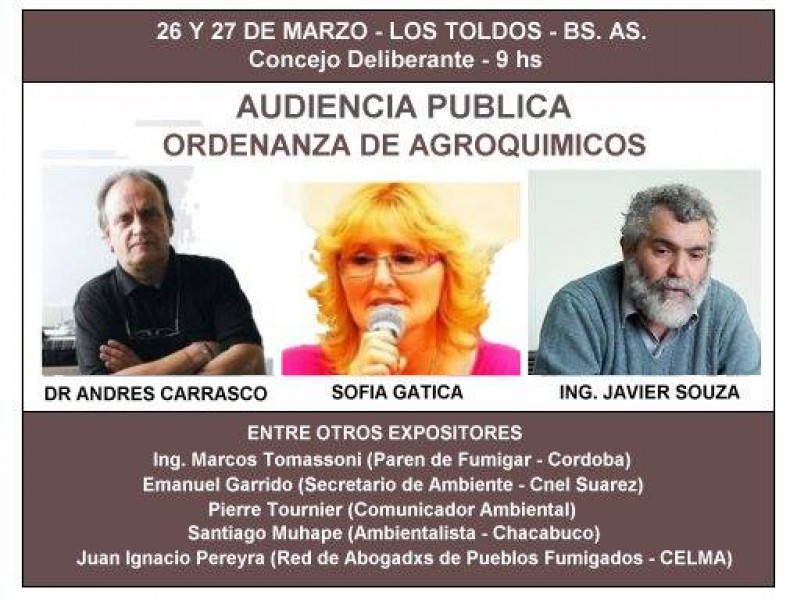 Los días 26 y 27 de marzo 2014celebraremos, desde las 9 hs, las primeras Audiencias Públicas sobre las problemáticas a la salud y al ambiente que genera el uso indiscriminado de agro químicos en la agricultura actual versus los beneficios ambientales y económicos dela AGRO ECOLOGÍA –Los Toldos, Partido de GeneralViamonte, Bs. As.