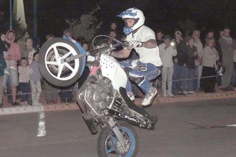 El showman realizó sus presentaciones en distintos puntos del país y llegó a nuestra ciudad con tres motocicletas, entre ellas la lanzallamas y la que gira 360 grados.