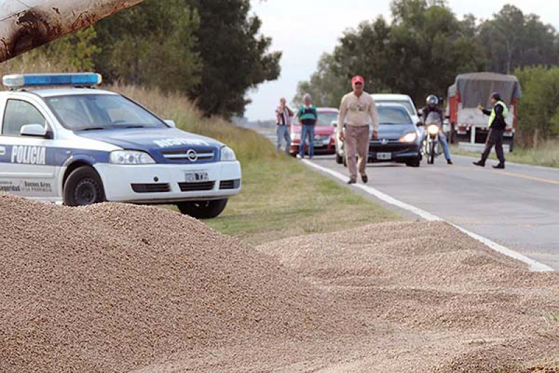 Parte de la carga de balanceados que se encontraba en el interior de la tolva quedó esparcida sobre la cinta asfáltica y la banquina, demandando una ardua tarea de Bomberos, que trabajó en el lugar junto con efectivos de la Policía Comunal y la Policía de Seguridad Vial.