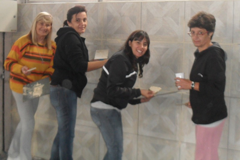 El primer encuentro fue el sábado 12 de abril desde las 8,30hs, la labor consistió en la colocación de cerámicos, prestando herramientas, acompañando con el mate, comida a la canasta para el descanso del mediodía y/o cualquier aporte que estuvo al alcance.