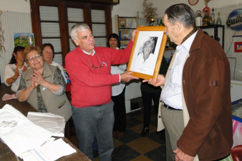 En oportunidad del almuerzo, el Intendente Battistella procedió a efectuar la entrega de un presente a la Comisión Directiva del Centro, consistente en un retrato de quien fuera una de las principales impulsoras del mismo, Rita Rebottaro.