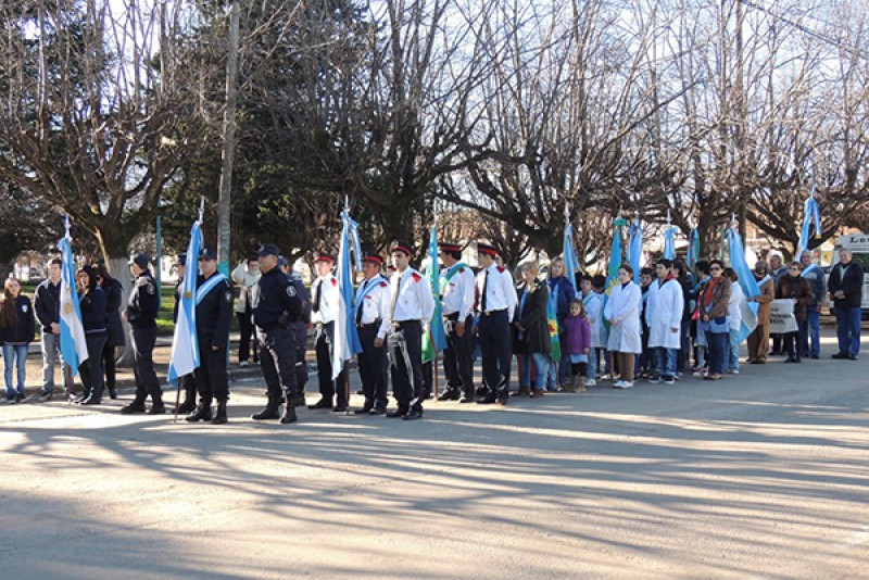 Tras el ingreso de las Banderas de Ceremonia, se entonaron las estrofas del Himno Nacional Argentino, se procedió a la colocación de una ofrenda floral, acto a cargo del Intendente Municipal, Dr. Walter Battistella y del Delegado Municipal, Jesús Mario Alvarez.
