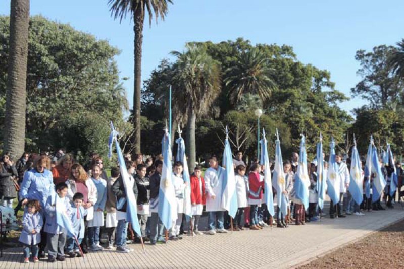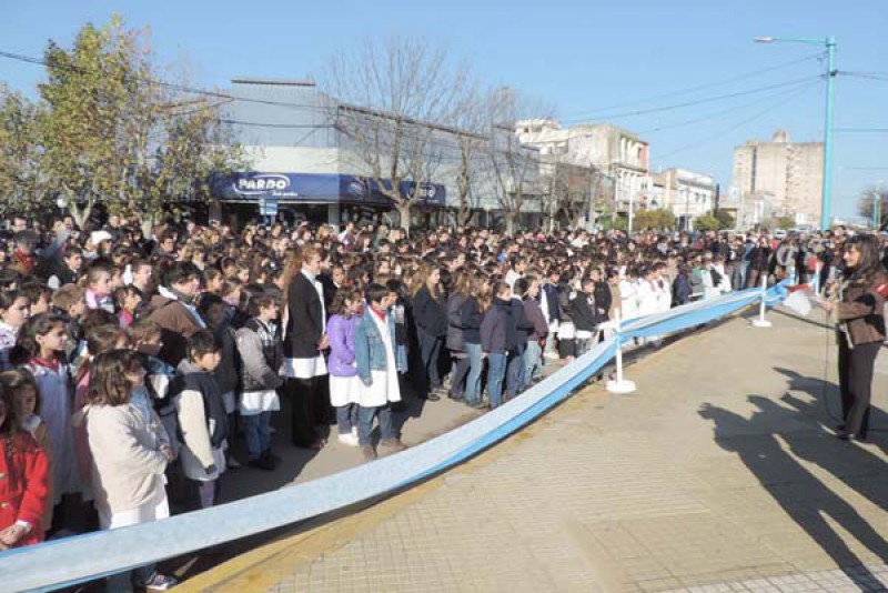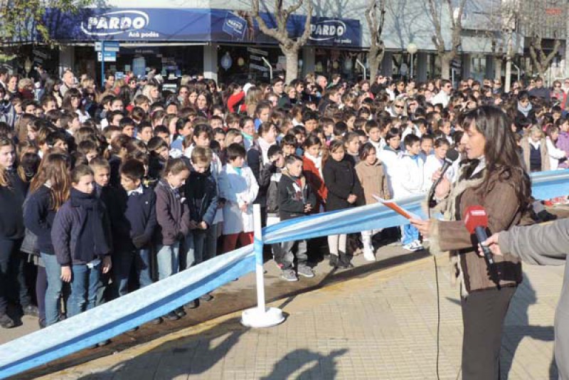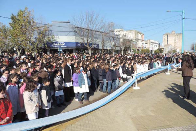 Tras el izamiento de Banderas, se entonaron las estrofas del Himno Nacional Argentino; en tanto que a continuación 735 alumnos de cuarto grado de los distintos colegios primarios del distrito prometieron fidelidad a la Enseña Patria, acto a cargo de la Inspectora Jefe Distrital, Iris Estelrich.