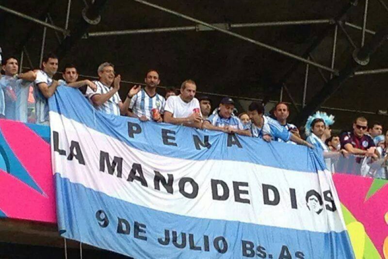 La barra “La Mano de Dios”, conformada por vecinos de nuestro medio, simpatizantes de distintos equipos y quienes participan activamente en las respectivas peñas y filiales, una vez más dejaron de lado sus “diferencias” futbolísticas para sumarse al aliento hacia la Selección Argentina en el Mundial de Fútbol Brasil 2014 y el pasado sábado dijeron presente en el partido disputado en Belo Horizonte, donde Argentina se impuso a Irán por 1 a 0, logrando la clasificación para la segunda fase.