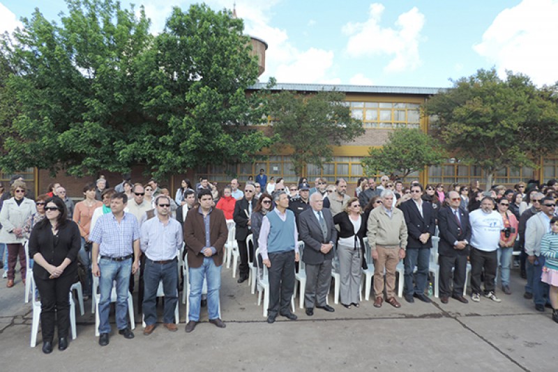 A las 09,30 hs., tras la llegada de autoridades invitadas y el ingreso de Banderas de ceremonia, se procedió al izamiento de Banderas (Nacional y ex Combatientes) y la entonación de las estrofas del Himno Nacional Argentino