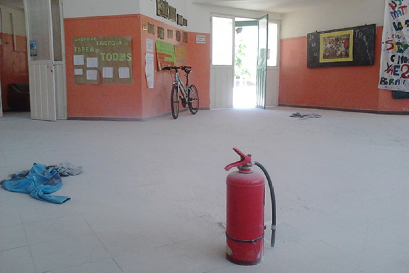 De acuerdo a lo que se pudo establecer, fueron vaciados completamente dos matafuegos de polvo sobre el SUM y la cocina del establecimiento, a la vez que fue sustraída documentación docente, llaves de distintas dependencias y una placa de bronce.