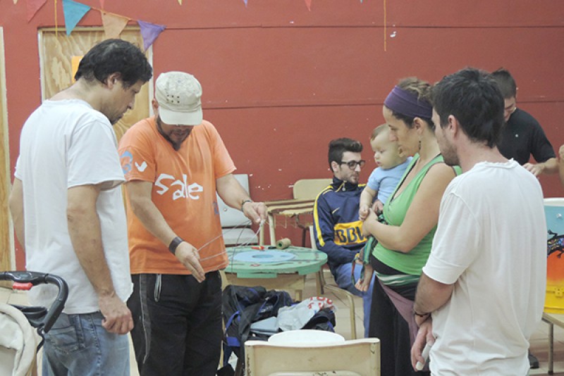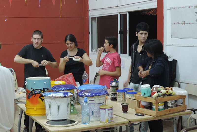 El Grupo de Teatro Comunitario Cruzavías recibe en estos momentos en su Escuela de Arte Cruzavías una importante visita para los 80 alumnos con que cuenta actualmente y para sus coordinadores, como es la de Cooperativa “Toco con Poco” de Unquillo, Córdoba, que realiza la creación de instrumentos musicales de percusión con material reciclado tales como tachos de pintura de plástico, caños de PVC, bolsas, placas radiográficas y otros materiales.