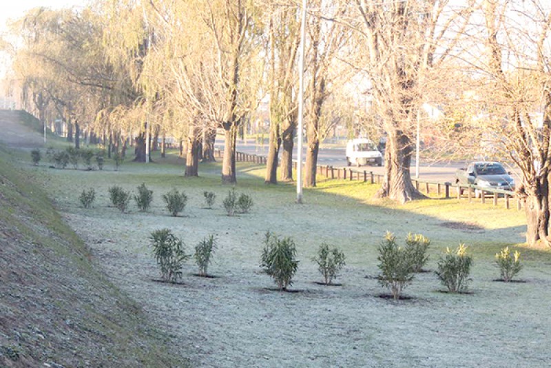 Llevó adelante cinco grandes canteros de diez arbustos cada uno con distintas especies: callistemons, cotoneaster, photinias, laureles de jardín y catorce árboles de pinto elliotis en la parte posterior del espacio verde.