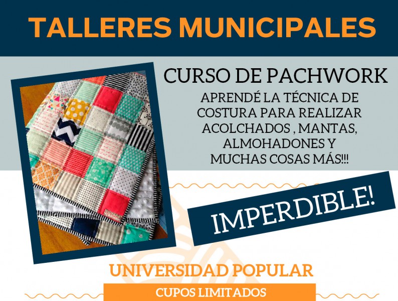 Y para el miércoles 5 de agosto el Curso de Pachwork (técnica de costura para realizar acolchados, mantas, almohadones). Para informes e inscripción, los interesados deben acercarse a la Universidad Popular, ubicada en calle Robbio Nº 322 en el horario de 8 a 12, con copia del DNI.
