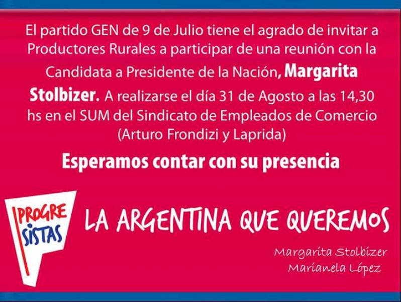 A las 13,30 hs. ofrecerá, una conferencia de prensa, en tanto que posteriormente se reunirá con productores agropecuarios de nuestro distrito y la zona y finalmente presidirá una reunión política con referentes de la Cuarta Sección Electoral.
