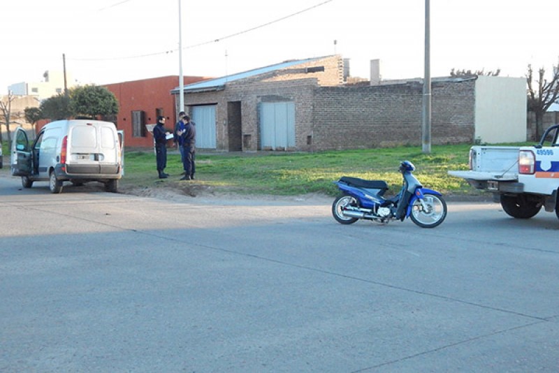 En la mañana de ayer, siendo aproximadamente las 7,45 hs, se produjo un accidente en la intersección de las calles Alsina y Av. A. Alvarez, protagonizado por una motocicleta marca Corven Energy 110 cc., a bordo de la cual circulaba un hombre de aproximadamente 30 años, quien circulaba por calle Alsina, y un vehículo utilitario marca Renault Kangoo que conducía una persona de sexo masculino y que se dirigía por la mano en dirección hacia Av. Mitre.