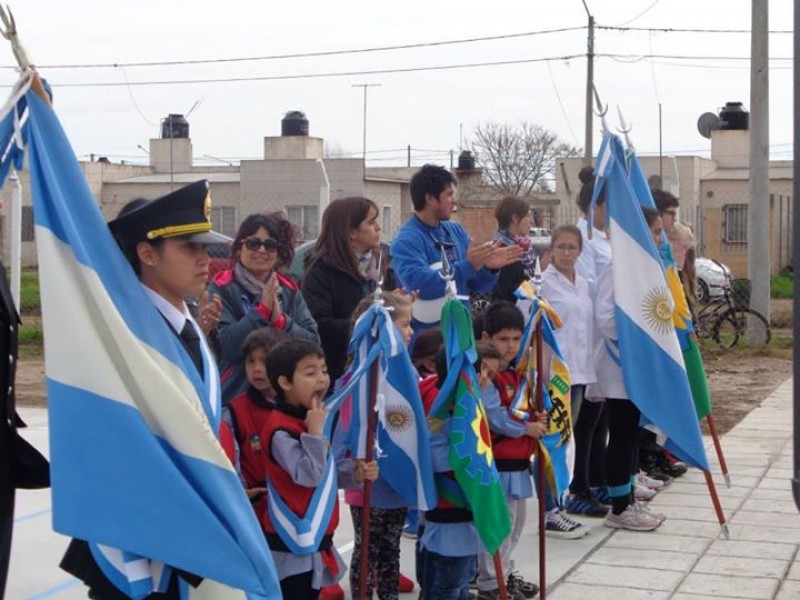 Se entonaron las estrofas del Himno Nacional Argentino, luego se produjo el corte de cita, y descubrimiento de placa inaugural, con Adriana Guevara, Cintia Legizamon, Directores del Jardín Nº 905, Primaria Nº 7 y Secundaria Nº 2, además de Cecilia Suárez, presidenta de la Comisión del Barrio.