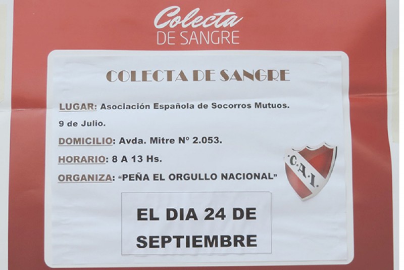 Como “Tiempo” lo adelantara, a través de la Peña “El Orgullo Nacional” del Club Atlético Independiente de Avellaneda en nuestra ciudad, se llevó adelante ayer jueves, de 8 a 13 hs., en la sede de la Asociación Española (Avda. Mitre 2053), la cuarta colecta solidaria de sangre coordinada por el Servicio de Hemoterapia del Hospital Zonal de Agudos “Julio de Vedia”, la que encontró importante respuesta de la comunidad.