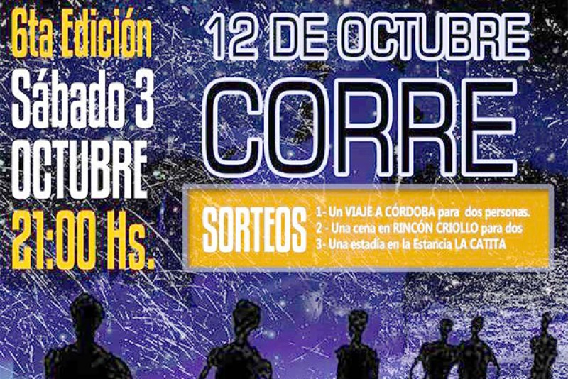 Se viene la 6° Edición de “12 de Octubre Corre”. El próximo sábado 3 de octubre a las 21 hs. en 12 de Octubre. Los interesados pueden en la Secretaría de Deportes o en la largada desde las 20,30 hs.. Los 3 km. son sin costo y los 6 km. tienen un costo de $100.