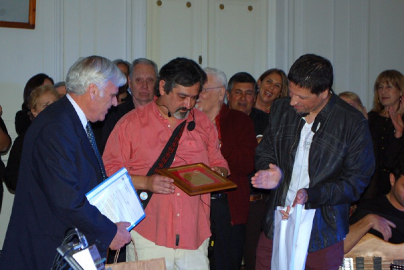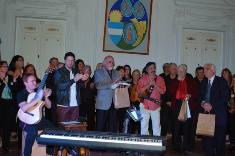 En el marco de la presentación, el intendente Municipal, Dr. Walter Battistella procedió a la entrega de un presente y una Distinción al Mérito al director de la agrupación organizadora de Octubre Coral, Raúl Cerdeira.