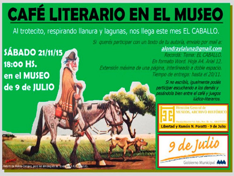 El Gobierno Municipal, a través de la Dirección de Museo y Archivo Histórico, invita al nuevo encuentro del Café Literario que se prevé realizar en el Museo el sábado 21 del corriente a las 18 hs.