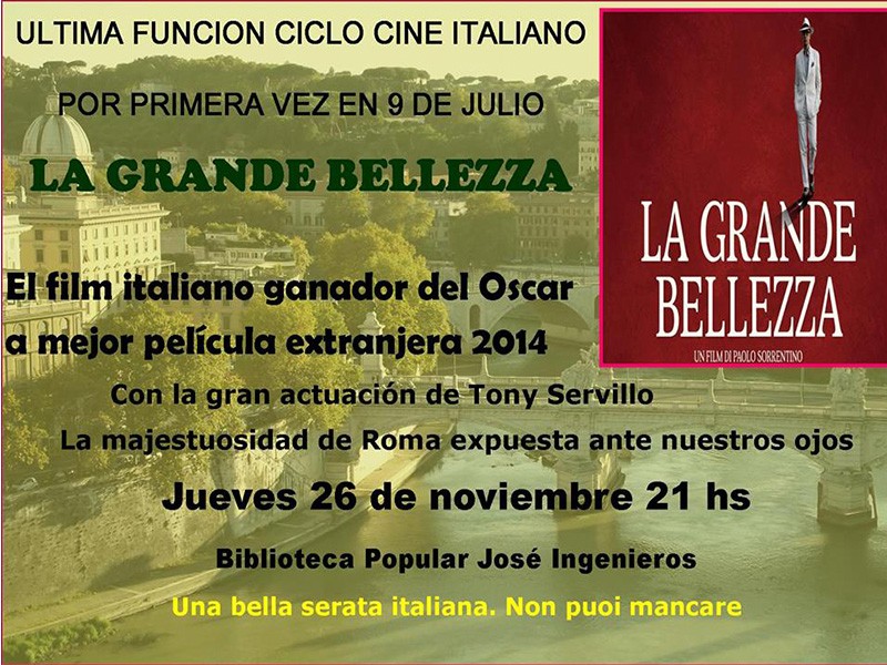En esta oportunidad, la película proyectada será “La Grande Bellezza”, film ganador del Oscar 2014 a Mejor Película Extranjera, con la gran actuación de Tony Servillo.