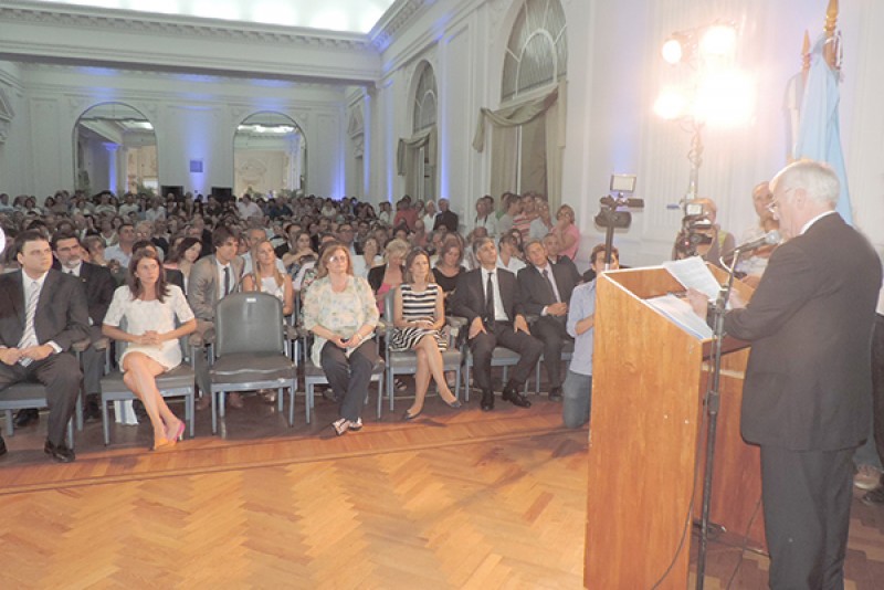 Tras estrecharse en un fuerte abrazo con su familia y sus más directos colaboradores, se dio inicio al acto con las oraciones a cargo del pastor Emilio Peralta y el Obispo Diocesano de 9 de Julio, Mons. Ariel Torrado Mosconi.