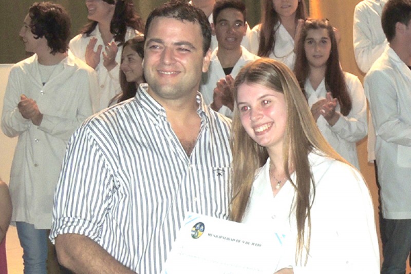 En la noche del pasado martes, el Intendente Municipal de 9 de Julio, Cdor. Mariano Barroso; acompañado por la presidente del Consejo Escolar, Marisa Poratti, asistió al acto académico de egresados de la Escuela de Educación Secundaria Nro. 7 (ex Escuela de Comercio), oportunidad en la que procedió a entregar un diploma a la egresada de mejor promedio del establecimiento (9,45), Valentina Merico Menéndez.