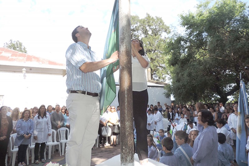 Tras la presentación de las Banderas de Ceremonia y la entonación de las estrofas del Himno Nacional Argentino, el Intendente Municipal, junto a la Inspectora Jefe Distrital, procedió a efectuar el izamiento de la Bandera Nacional.