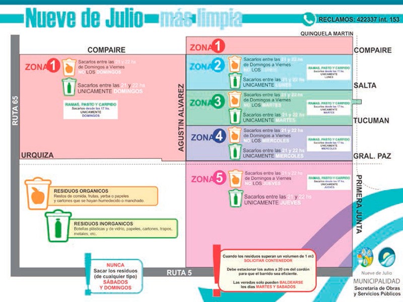 La Municipalidad de Nueve de Julio, a través de la Secretaria de Obras y Servicios Públicos, informa que se deben respetar los días y horarios para sacar los residuos orgánicos, inorgánicos y ramas, pasto y carpido.