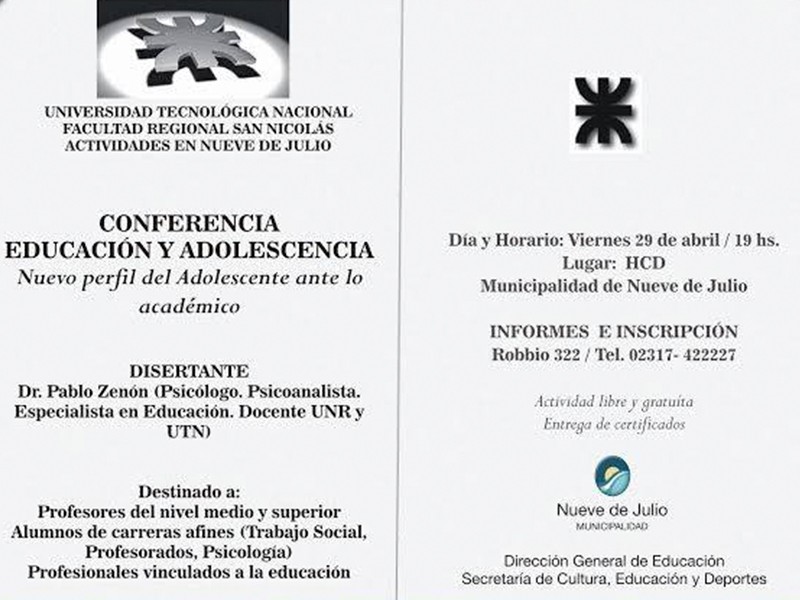 La Municipalidad de Nueve de Julio, a través de la Secretaría de Cultura, Educación y Deportes y la Dirección General de Educación; con el apoyo de la Universidad Tecnológica Nacional y su Facultad Regional San Nicolás; habrá de desarrollar hoy, viernes 29 de abril, a las 19 hs., y en el recinto de sesiones del H. Concejo Deliberante, una interesante conferencia sobre Educación y Adolescencia, en la que se abordará el tema “Nuevo perfil del adolescente en lo académico”, a cargo del Dr. Pablo Zenón (psicólogo, psicoanalista, especialista en Educación y docente de la UNR y UTN).