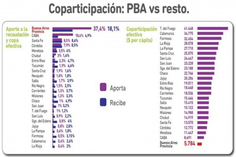Debemos tener en cuenta aspectos muy importantes: Buenos Aires es la provincia con mayor densidad poblacional, la que más aporta en concepto de recaudación y la que menos beneficios recibe en la distribución. Y lo que es más importante aún, es la provincia que concentra mayor cantidad de pobres. Resulta poco razonable que nuestra provincia sea la que presenta el presupuesto más bajo en comparación con las del resto del país. A modo de ejemplo, Buenos Aires aporta $37 por cada $100 que recauda la Nación y sólo recibe $18.