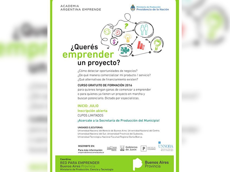 La inscripción, abierta y gratuita, y con cupos limitados, puede realizarse en la oficina de Producción de la Municipalidad de Nueve de Julio. Está destinado a quienes tengan ganas de comenzar a emprender, o para quienes tienen un proyecto en marcha y buscan potenciarlo.