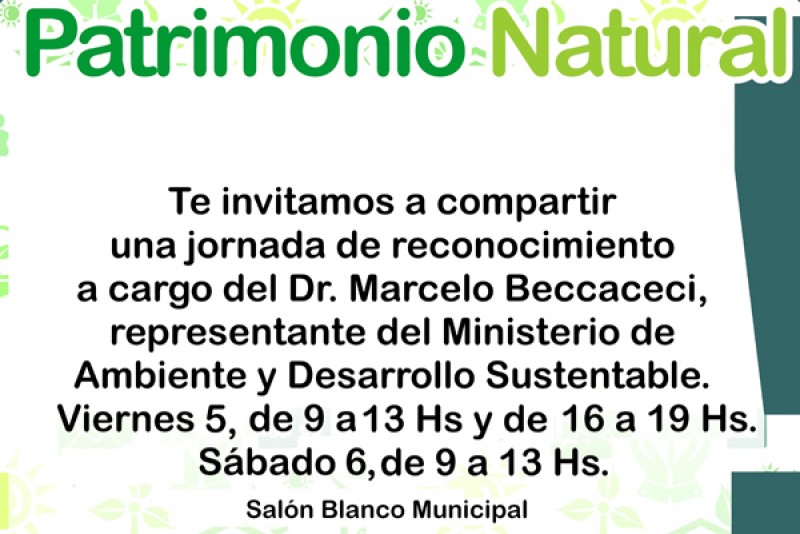 La Dirección de Gestión Ambiental de la Municipalidad de Nueve de Julio invita a la Jornada de Reconocimiento del Patrimonio Natural de nuestro distrito, que incluirá una charla a cargo del Dr. Marcelo Beccaceci, representante del Ministerio de Ambiente y Desarrollo Sustentable, y que se dictará el día 5 de agosto, de 9 a 13 y de 16 a 19 hs., y el día sábado 6, de 9 a 13 hs., en el Salón Blanco Municipal.