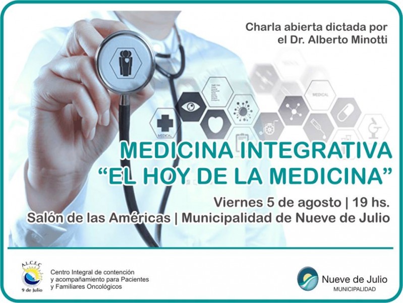 Con el auspicio y acompañamiento de la Municipalidad de Nueve de Julio, el Centro de Contención y Acompañamiento Para pacientes y Familiares Oncológicos de ALCEC 9 de Julio, se desarrollará hoy, viernes 5, desde las 19 hs., en el Salón de las Américas del Palacio Municipal una charla abierta sobre el tema “Medicina Integrativa: el hoy de la medicina”, a cargo del Dr. Alberto Minotti.