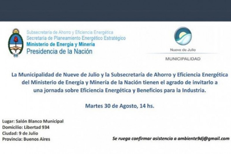La Municipalidad de Nueve de Julio, a través de la Dirección de Gestión Ambiental y la Subsecretaría de Producción; y la Subsecretaría de Ahorro y Eficiencia Energética del Ministerio de Energía y Minería de la Nación, invitan a una jornada sobre “Eficiencia Energética para empresas e industrias”, que se dictará hoy, martes 30 de agosto a las 14 Hs., en el Salón Blanco del Palacio Municipal.