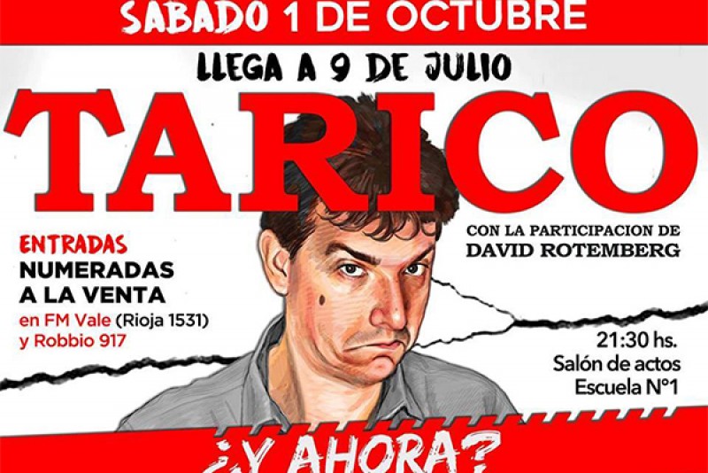 Nuestra ciudad recibirá el sábado 1º de octubre, desde las 21,30 hs. a uno de los artistas con mayor repercusión y más talentoso del momento como es el que lleva adelante el humorista e imitador Ariel Tarico, quien se presentará en el salón de actos de la Escuela Nro. 1 “Bernardino Rivadavia”, repitiendo seguramente el éxito alcanzado en su anterior presentación.