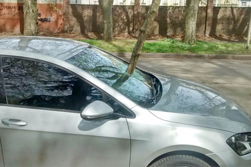 Cuando habían pasado algunos minutos de las 10 hs. de ayer, en la Avda. Tomás Cosentino casi Ramón N. Poratti, un automóvil VW Golf de color gris, que se hallaba estacionado en el lugar, se vio seriamente dañado por la caída de un gajo de un árbol de gran porte que se erige sobre la acera del parque Gral. San Martín.