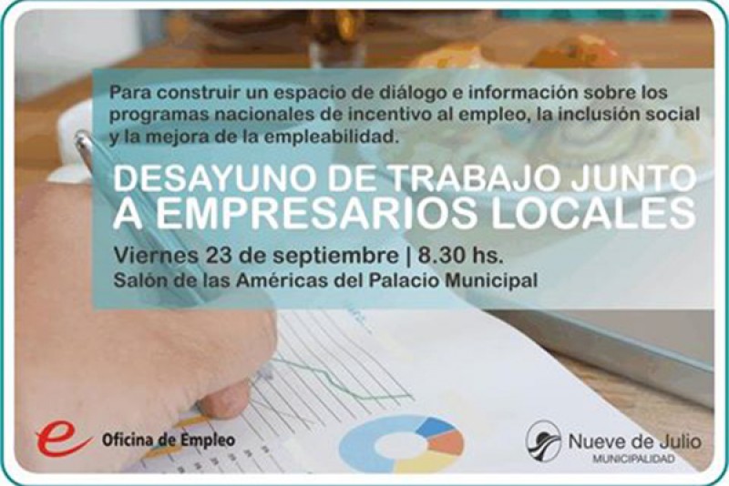 La Oficina de Empleo de la Municipalidad de Nueve de Julio, convoca a un desayuno de trabajo que tendrá lugar hoy, viernes 23 del corriente, a las 8,30 hs., en el Salón de las Américas del Palacio Municipal, en el que, generando un espacio de diálogo y construcción, se informará sobre la aplicación de programas nacionales para incentivar el empleo, la inclusión social y la mejora de la empleabilidad en nuestro distrito.