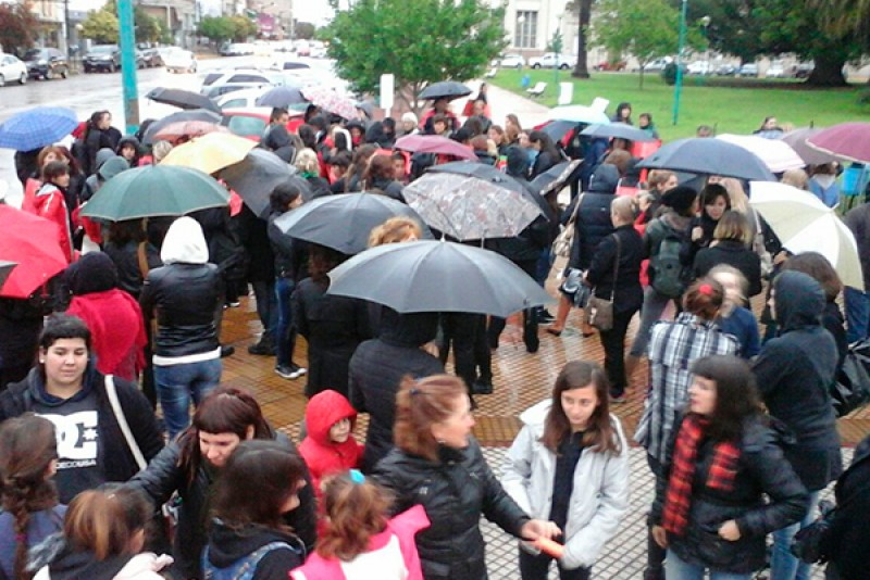 La Plaza Belgrano, como siempre, epicentro en nuestra ciudad, comenzó a cubrirse de paraguas por las condiciones climáticas del día de hoy, con la llegada de familias y personas de todas las edades, la mayoria vestidos de negro en señal de luto por los femicidios, portando banderas, pancartas y afiches con la leyenda de la convocatoria.